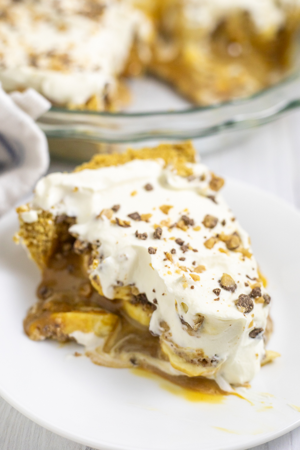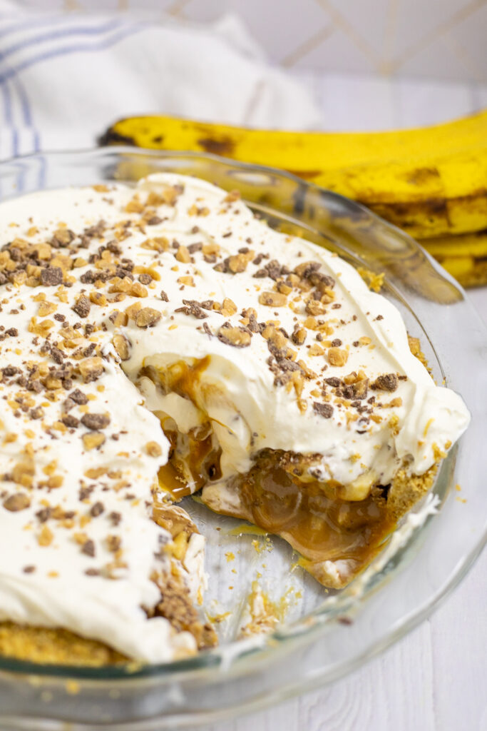 This Banoffee Pie is layered with buttery graham cracker crust, silky dulce de leche, fresh bananas, fluffy whipped cream, and crunchy toffee bits. A rich, creamy dessert thatโs sweet and indulgent.